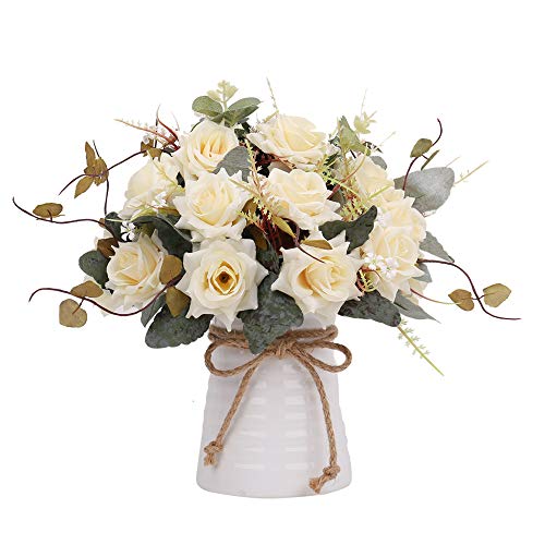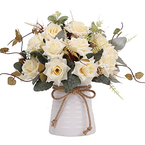 Package : Pack of 3 artificial rose bouquets ,1 silver dollar eucalyptus and 1 ceramics vase.